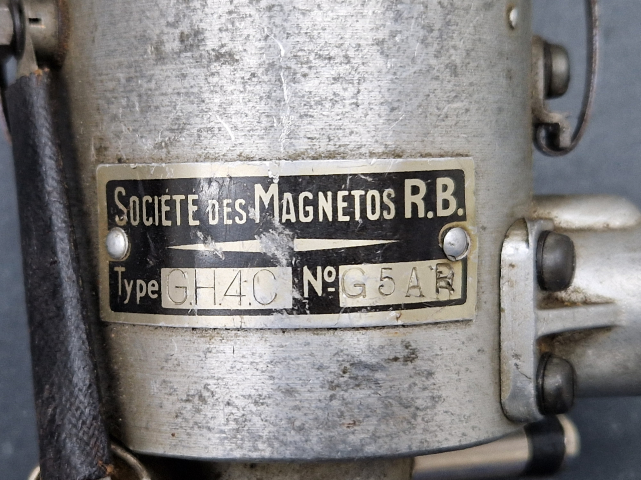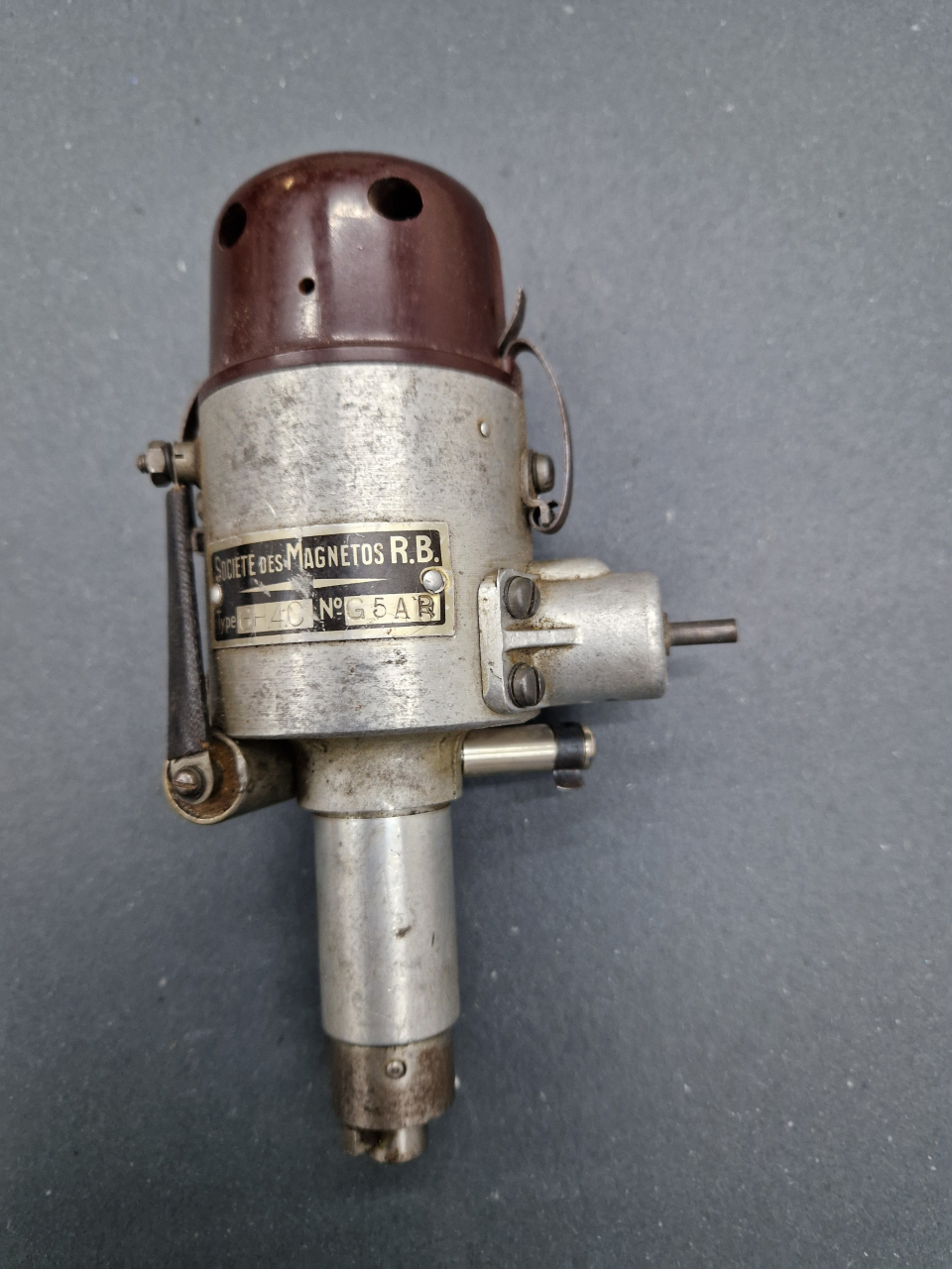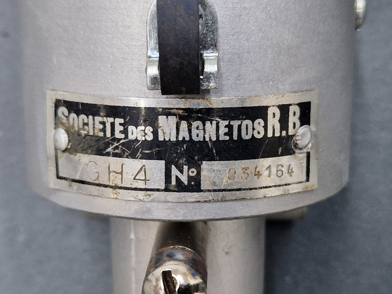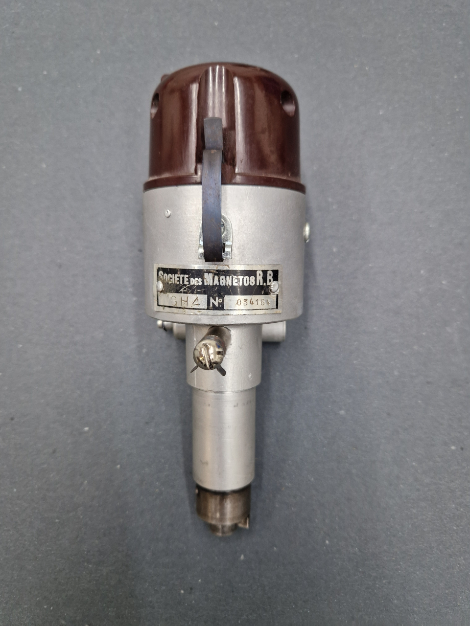 - 709.299 - d'avril 1934 (Lancement de la 7A) à mars 1935 – Distributeur d'allumage de marque R.B. (Rousset et Bignon(2)) référence GH4 pour 7A, 7B, 7S, 7C, 11AL et 11A. Il est constitué d'un corps en aluminium moulé et usiné (réf. 709.132) à l'intérieur duquel est fixé une plaque de rupture (réf. 709.139) en acier fixée par 3 vis, sur cette plaque est fixé le rupteur (réf. 709.140 et 709.142), un ressort plat fixé au rupteur et au corps permet de maintenir le contact du rupteur sur la came. L'arbre (réf. 709.133) est entrainé par le moteur via une "commande de tournevis(3)" (réf. 709.155), sur cet axe sont fixé deux masses d'avance automatique (réf. 709.150), celle-ci en fonction de la rotation du moteur et la force d'inertie, décale légèrement l'avance en faisant tourné la came (réf. 709.302). Un doigt (réf. 709.136) est emmanché en bout de la came. La tête d'allumeur (réf. 709.134) est en bakélite marron ou noir à sortie horizontale, elle est maintenue par deux ressort plat de maintien (réf. 709.156). Le condensateur est fixé sous le corps du distributeur. Un huileur extérieur (réf. 709.123) permet le graissage de l'axe.