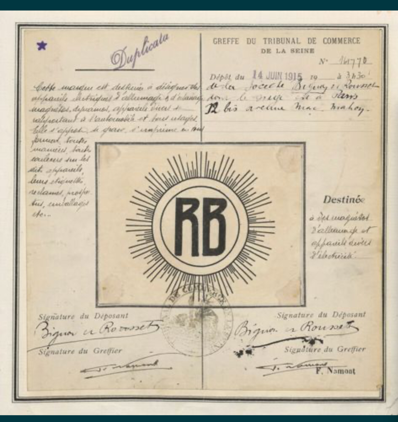 (2) La signification des initiales R.B., contrairement à ce qu'affirme certaines sources récentes ne signifie pas Robert Bosch. Les initiales de cette marque signifie Rousset et Bignon comme le prouve ce document :
